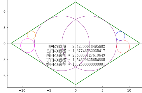 @printf("直径の和 = %.15g, 正方形の一辺と弦の差 = %g\n", 2(r1 + r2 + r3), g - s)