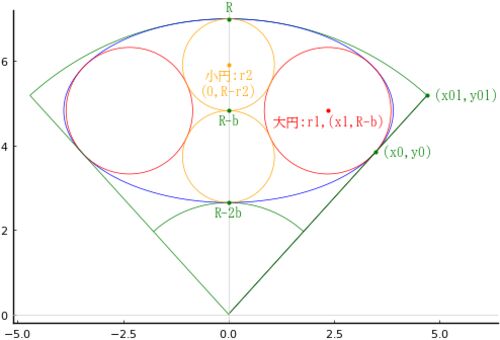 31 岩手県一関市赤荻字宿 正慶山観音寺 弘化4年(1847) 安富有恒:和算—岩手の現存算額のすべて,青磁社,東京都,1987.http://www.wasan.jp/iwatenosangaku_yasutomi.pdfキーワード:円4個,楕円,扇#Julia #SymPy #算額 #和算 #数学 扇面に楕円を描き,その…
