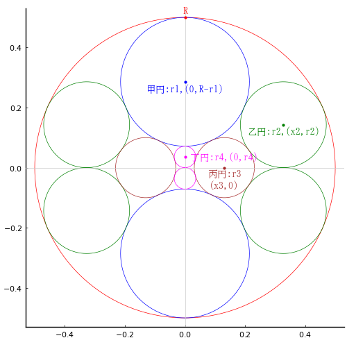円5個,外円,弦,団扇,極値,最小値 算額(その1805)